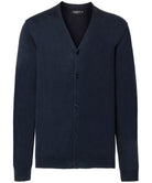 Classic Fit. Contemporary styling. V-cut long sleeved cardigan. Elastane on ribbed cuffs and waistband trim to retain shape and smart appearance. Refine button up fastening with inside facing and dyed-to-match buttons. Fully fashioned . Quick to dry and easycare. 50% Cotton, 50% Acrylic cotton blend. 275gsm